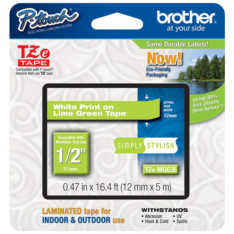 Simply Stylish TZe tapes come in vibrant colors to create stylish labels. This tape features Brother's exclusive laminated tape process and standard adhesive. Perfect for everyday applications. These labels stay on under normal indoor and outdoor use, including hot and cold environments. Best suited for smooth flat surfaces.