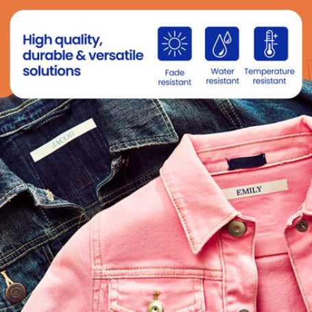 This tape is specially formulated for use on fabric. Printing results with navy blue lettering on a white cloth background. The label can be ironed onto virtually any cotton item.