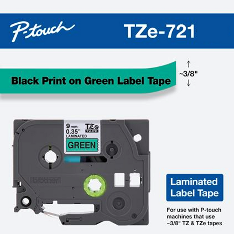 Brother 3/8" (9mm) Black on Green Tape - TZe721