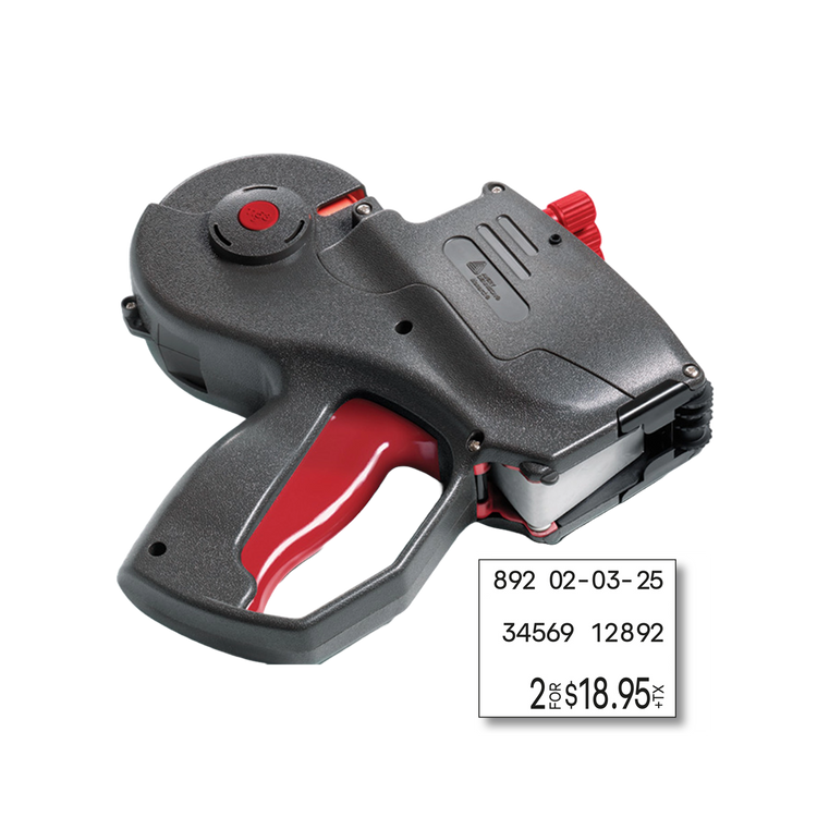 Great versatility, wide range of print options on Monarch's largest labels! Three line labeler with a total of 36 print positions.