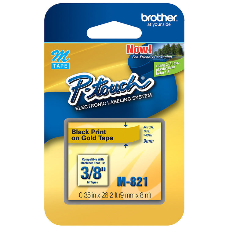 Brother 3/8" (9mm) Black on Gold Non-Laminated Tape - M821